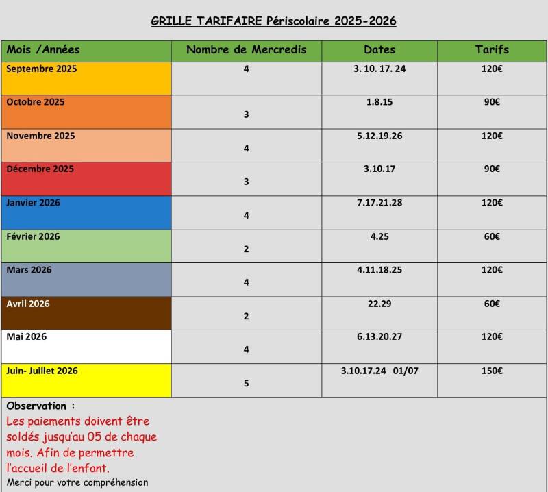 | Périscolaire forfait 4 Mercredis | 120€ |